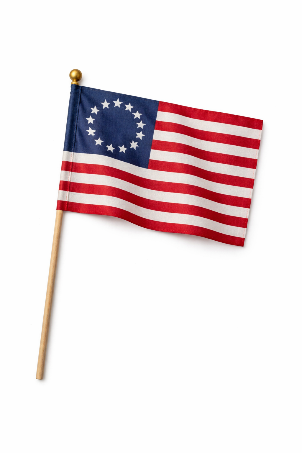 Quantity & Size: 12 Pack 4"x6" Betsy Ross Natural Staff Stick Flags Gold Ball