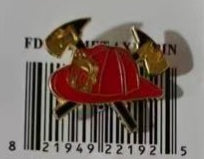 This collectible item is a firefighter helmet pin featuring crossed axes, symbolizing fire rescue services.